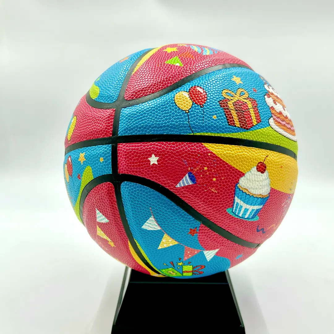 - High Visual Appeal: These custom printed basketballs use highly saturated colors (blue, pink, yellow, red) paired with numerous cartoon patterns (stars, flags, suns, etc.), creating a lively and cheerful visual effect that is highly appealing to children and teenagers.